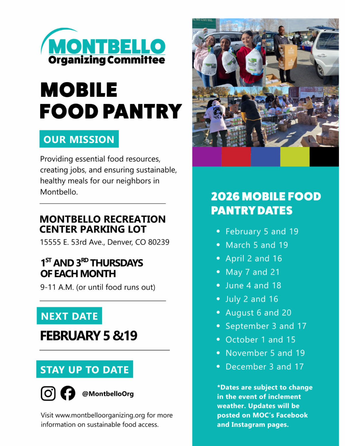Montbello Food Pantry, is the 1st & 3rd Thursday of every month. Reach out to silvia.gonzalez@montbelloorganizing.org for more information.
